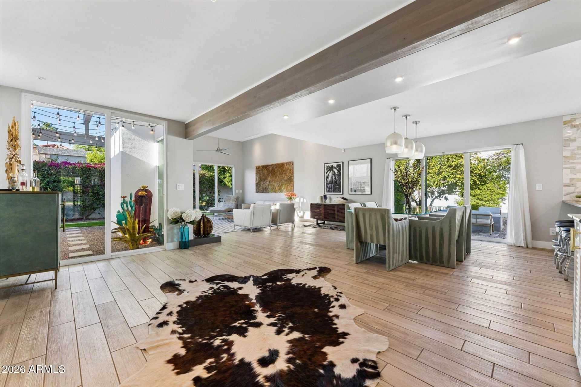 Welcome Home to this exceptional mid-century patio home in the heart of Scottsdales coveted McCormick Ranch Sands community. Designed by renowned architect E.T. Wright, this private and serene retreat sits on a quiet cul-de-sac, offering the perfect lock-and-leave lifestyle with effortless access to Old Town Scottsdale, charming cafés, boutique shopping, and picturesque tree-lined trails.At the center of this beautifully redesigned home lies a tranquil private courtyard anchored by a sparkling pool, creating an idyllic setting for relaxation and entertaining. The completely reimagined open-concept floor plan blends timeless mid-century character with sophisticated modern living. Soaring twelve-foot ceilings with double-volume insulation, driftwood tile flooring, and fresh interior and and exterior paint create a bright, airy atmosphere throughout. Signature details like the original E.T. Wright slump block accent wall add authentic architectural charm, while upgraded hardware, recessed lighting, and contemporary ceiling fans elevate every space.The gourmet kitchen has been thoughtfully redesigned around a generous central island, featuring sleek modern cabinetry, luxurious quartz countertops, a striking Calacatta marble backsplash, a high-end gas cooktop with stainless steel hood, double ovens, and premium stainless steel appliances.The primary suite is a true retreat, enhanced by an expansive walk-in closet, elegant barn doors, designer closet doors, and a spa-like bathroom complete with a deep insulated soaking tub, updated shower, floating vanities with quartz countertops, fresh tile, and additional skylights that flood the space with natural light. A light-filled atrium and private patios off the bedrooms seamlessly extend living areas outdoors.Additional highlights include a sophisticated 300-bottle wine room with cedar racking and glass door, a fireplace with plumbed gas stub, energy-efficient dual-pane windows and sliding doors throughout, a Nest thermostat, and a high-efficiency air conditioning system for optimal comfort and savings. Outside, enjoy a built-in barbecue with granite countertops, a gas stub ready for a future firepit, a custom steel gate, 220-volt electric vehicle charging, updated electrical systems, and mature citrus and palm trees that enhance the lush surroundings. The industrial rolled roof with double-volume insulation and updated copper piping reflect the quality and care invested throughout, while the garage offers ample storage space.This rare E.T. Wright-designed patio home perfectly combines architectural heritage with todays most desired modern comforts, delivering resort-style living in one of Scottsdales most desirable neighborhoods. Schedule your private showing today to experience this move-in ready sanctuary for yourself.